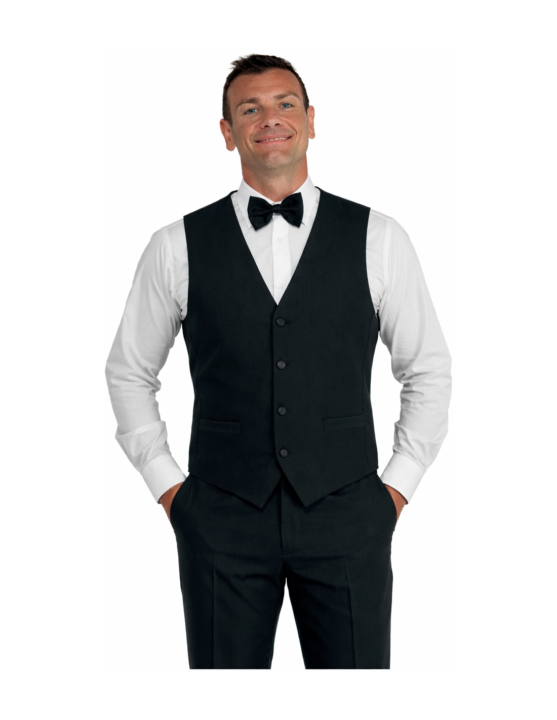 Gilet nero da cameriere ISACCO, elegante e professionale, realizzato in 100% poliestere foderato antimacchia da 220 g/m².
