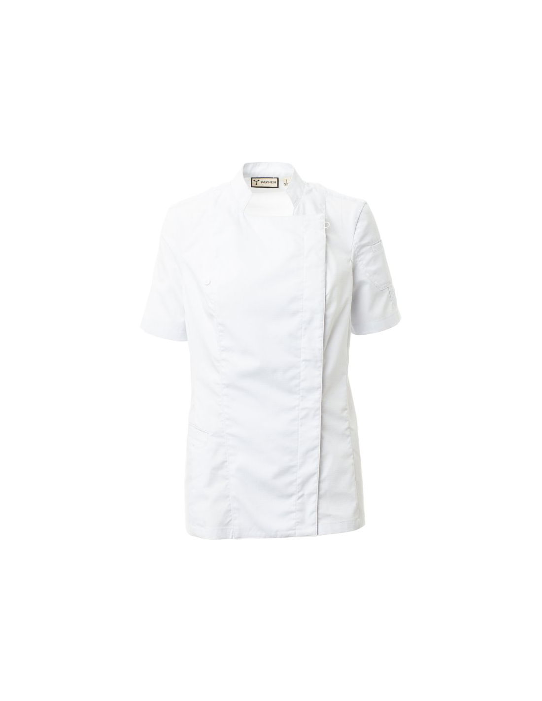 Giacca da cuoca da donna bianca, mezza manica, modello STARLIGHT MESH LADY, realizzata in cotone ripstop ed elastomultiestere, con inserti in rete traspirante sulla schiena. Design con collo alla coreana, chiusura a doppio petto e pratiche tasche.