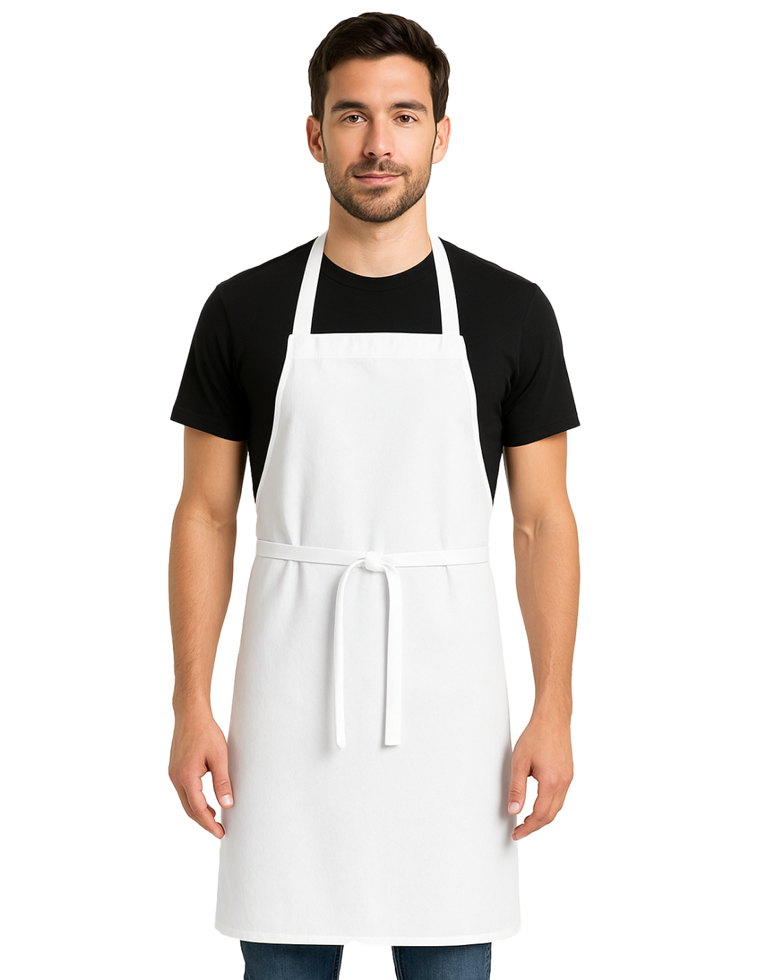 Grembiule da cuoco bianco con pettorina marca RISTOHOUSE, realizzato in 100% cotone 200 g/m².