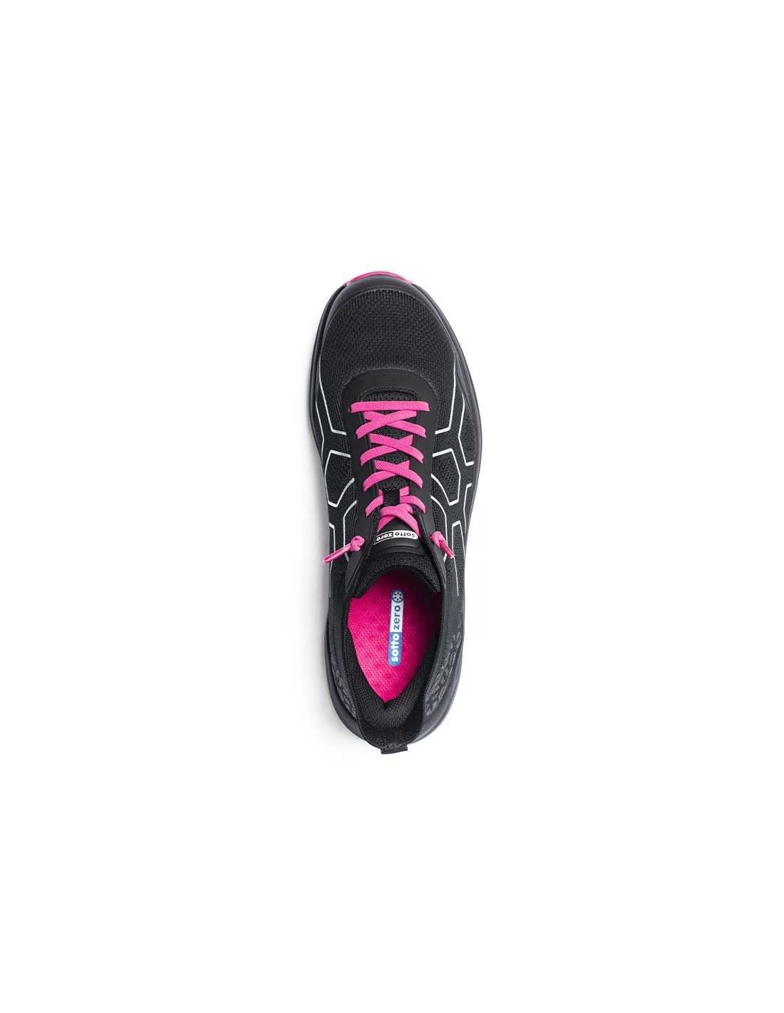 Scarpa antinfortunistica Superleggera SOTTOZERO FlexiFly S1P, Nero/Fucsia. Tomaia Flyknit + TPU, puntale in fibra di carbonio, soletta antiperforazione UHMWPE, sottopiede estraibile EVA + Mesh, suola Phylon/Gomma, taglie 35-42. Massimo comfort e leggerezza.